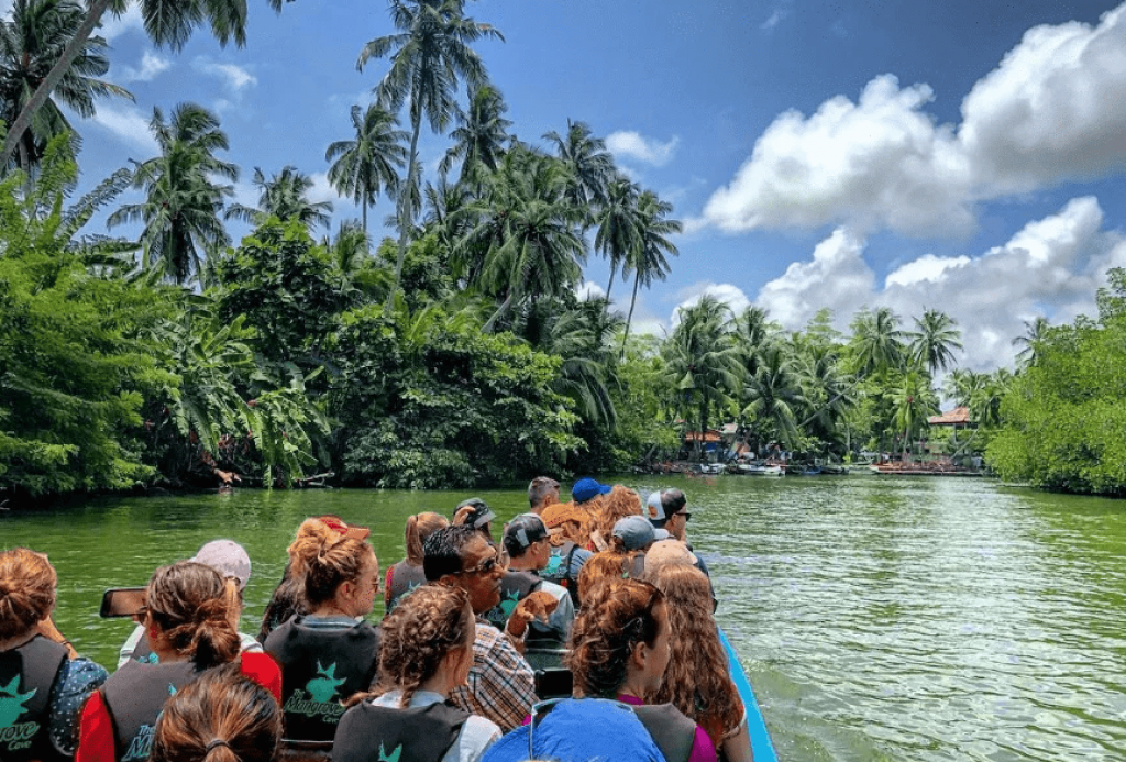 Rivière bordée de mangroves, parfaite pour une sortie nature calme en bateau. Observation d’oiseaux, de varans et découverte de la vie locale sur l’eau.