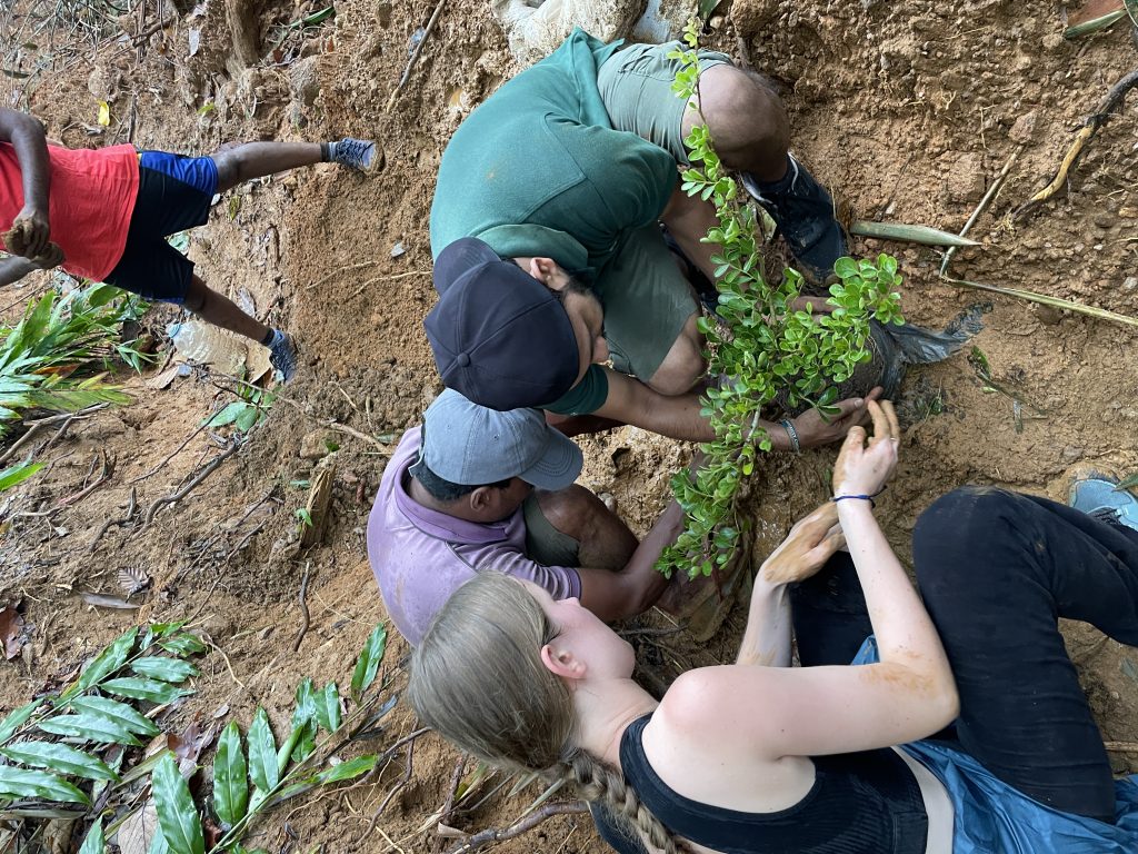 Sur place, les missions varient selon les besoins : plantation d’arbres, débroussaillage de terrains, construction de marches pour faciliter l’accès à certaines zones, ou encore entretien des espaces déjà restaurés. Ce projet plaît particulièrement à l’équipe, qui prend plaisir à y participer. La plupart du temps, plus de la moitié de l’équipe se mobilise pour ces journées sur le terrain.